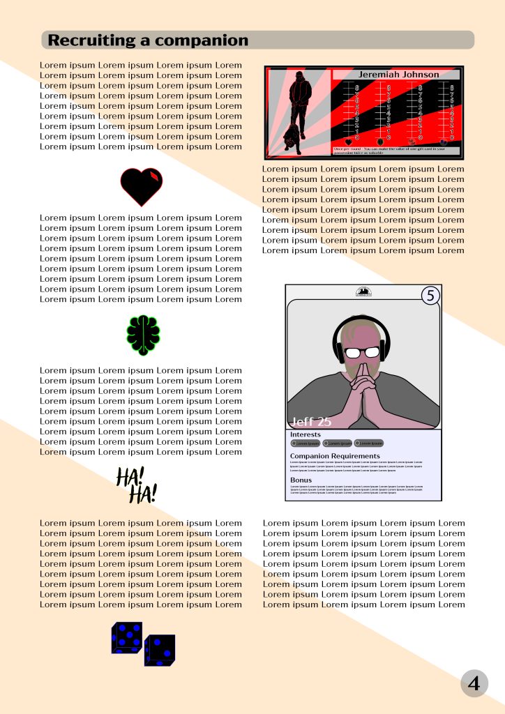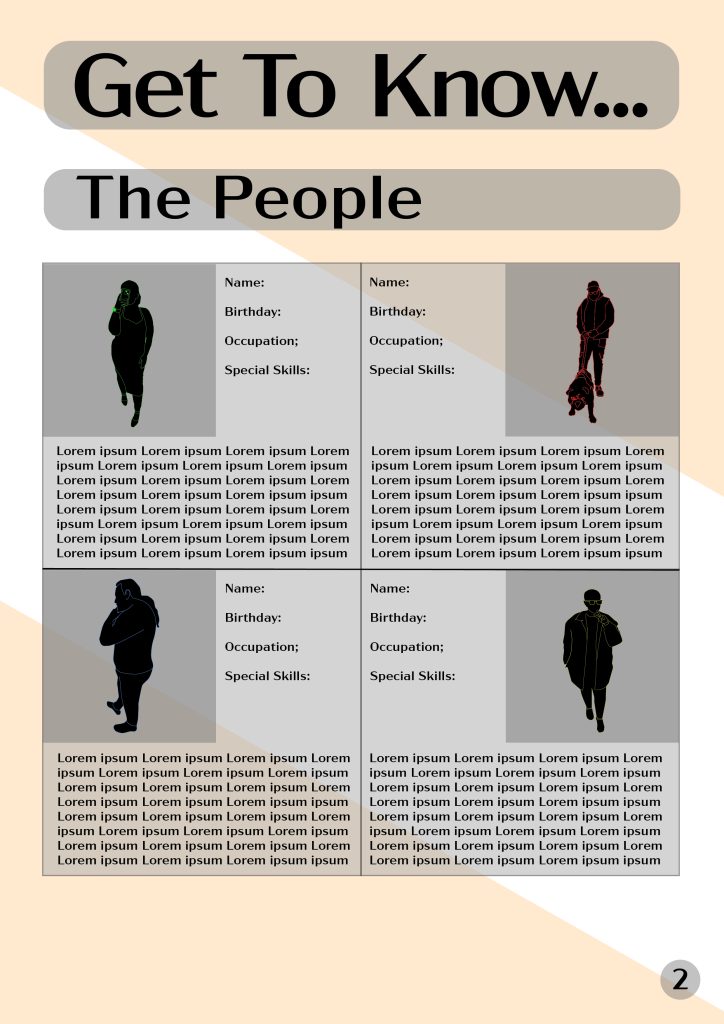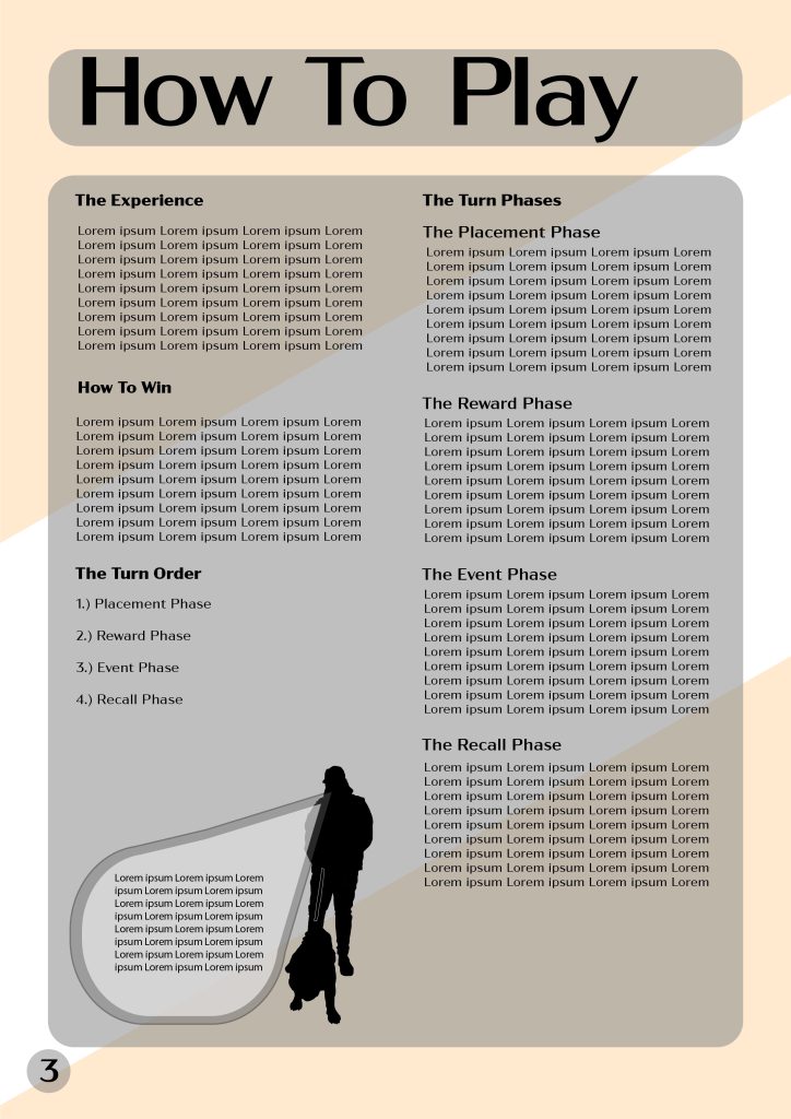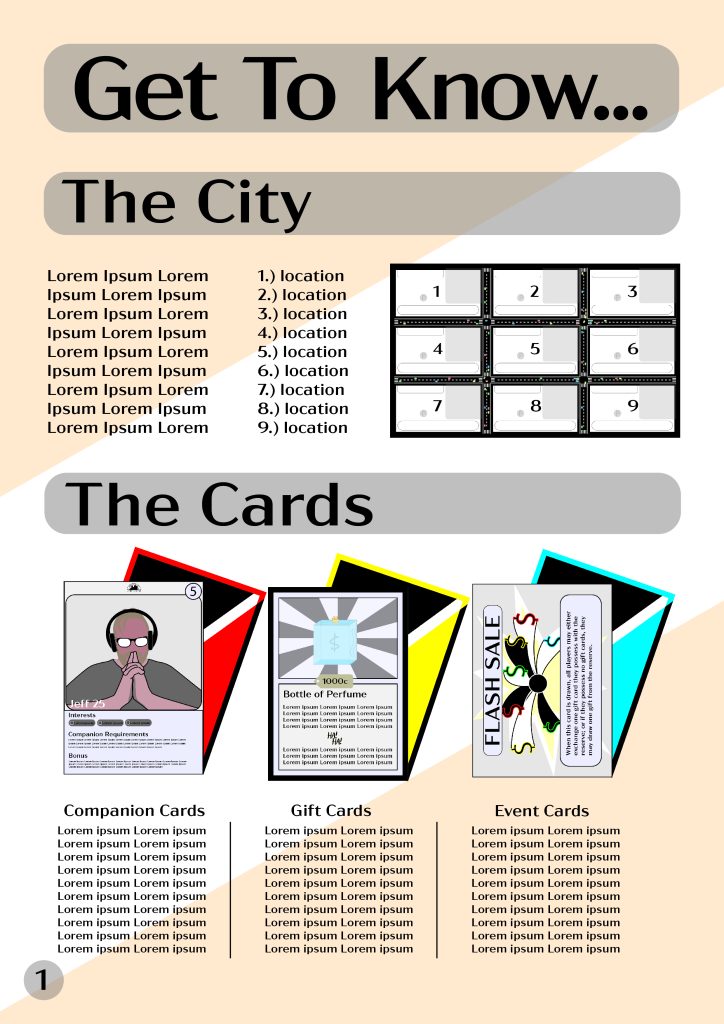 For the editorial information pages I have designed the first four pages of the rulebook for Affinicity. Trying to conceive an idea for this I took inspiration from one of the cover designs and decided to pursue the theme of the travel guide. The design process then began by arranging the layout of how the information was to be presented. The font decision was based on the font within the lamppost logo design; Acme Gothic Wide. Once the titles and text placeholders were positioned the composition was adjusted as the nature of this type of editorial information requires the use of images alongside text to correctly convey information. The colours used were chosen due to the neutral colours, as we were taking information from a travel guide, it was noticed that most used white or similar as the background for dark text to be clearly written on top. Knowing the game uses strong colours throughout the pieces and cards, neutral colours were used to prevent any clash within the document between the elements. A stylistic choice was made to use a basic pattern of white and beige purely for aesthetic reasons. The approach to the target audience and purpose, the purpose of this document is to provide information on how to play the game. The easier someone can interpret the information, the better, in that sense the document was designed to provide that easy to read and understand format. All text is located in logical locations presented together with all other relevant pieces. The audience is a difficult subject as the audience of the rules would be anybody who is an audience of a game, it could be argued that the audience of rules is less important than the purpose. However, in a hypothetical scenario of a professional environment it would be that the audience of this would be whoever were to be higher up in position, so in that sense it would be presented as a concept design before the final product. In both instances it would achieve its target audience reasonably.