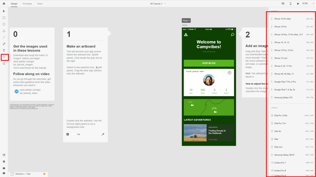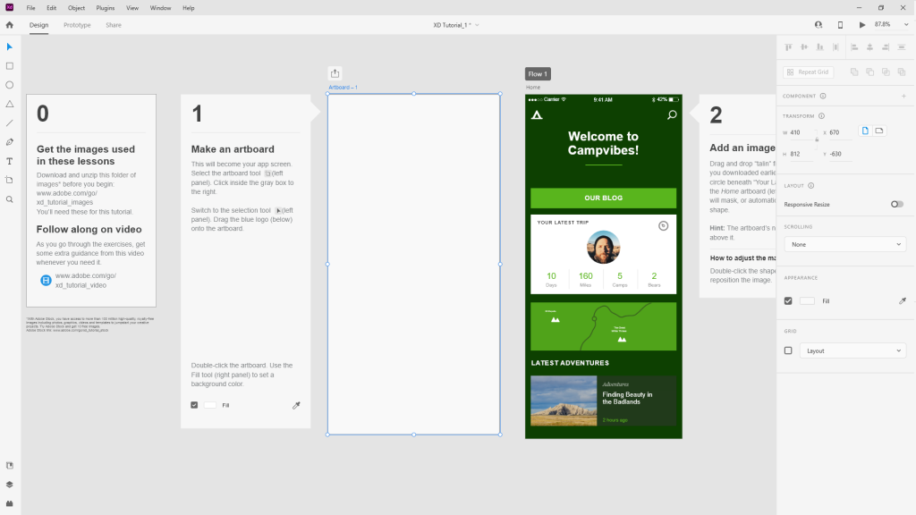 Adobe XD is a prototyping tool that can prove to be incredibly useful in the designing and visualisation of a website or in app design. A useful way to fully credit this tool is through a discussion of a personal experience navigating through tutorials that offer an insight into what the software has available. With the visual interface made available it allows a designer freedom to fully explore their ideas in the design process, by taking a blank canvas someone could produce a prototype at all different design and functionality levels. Here is the end product of one of the tutorials that made up part of this exercise.