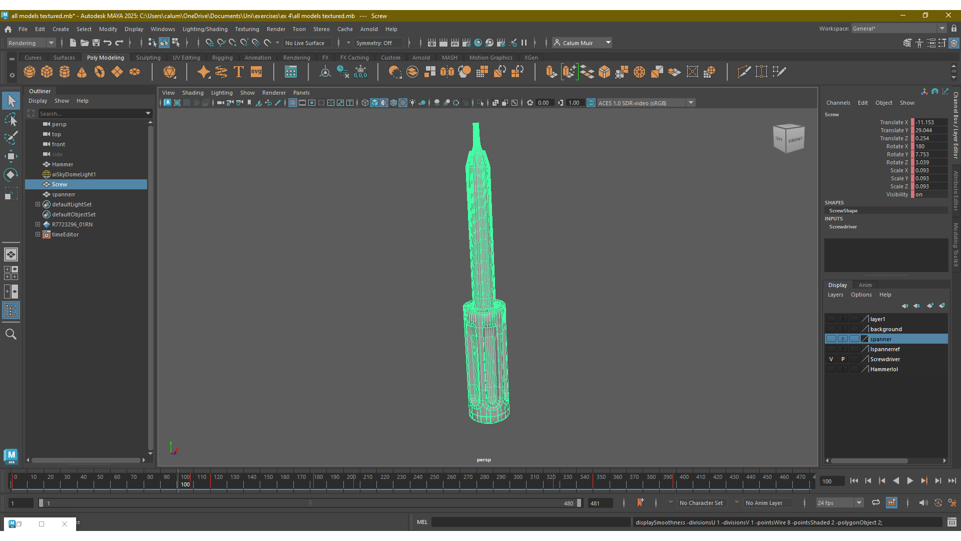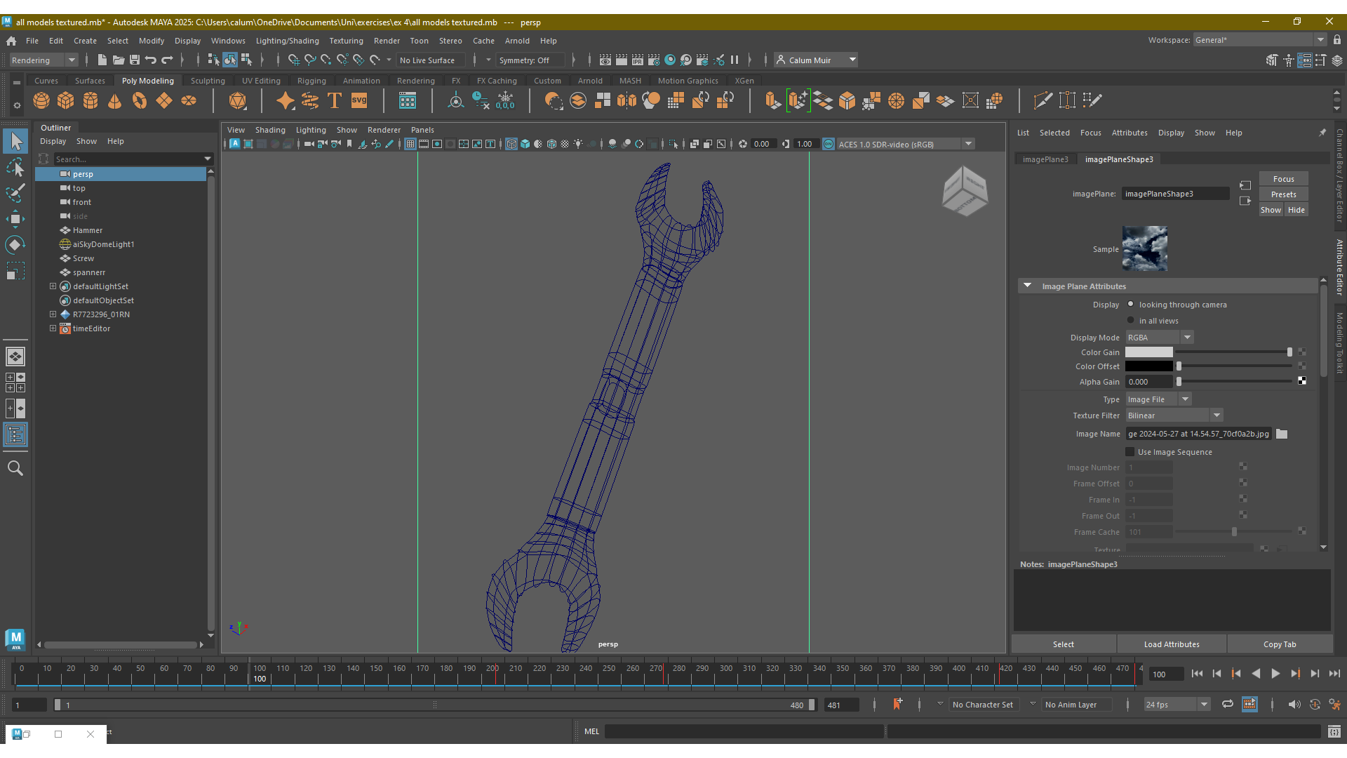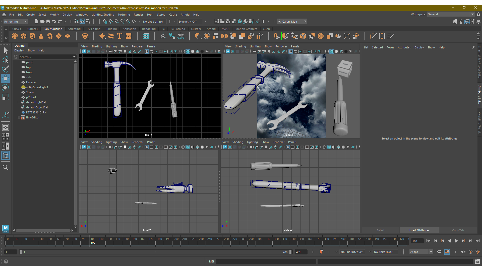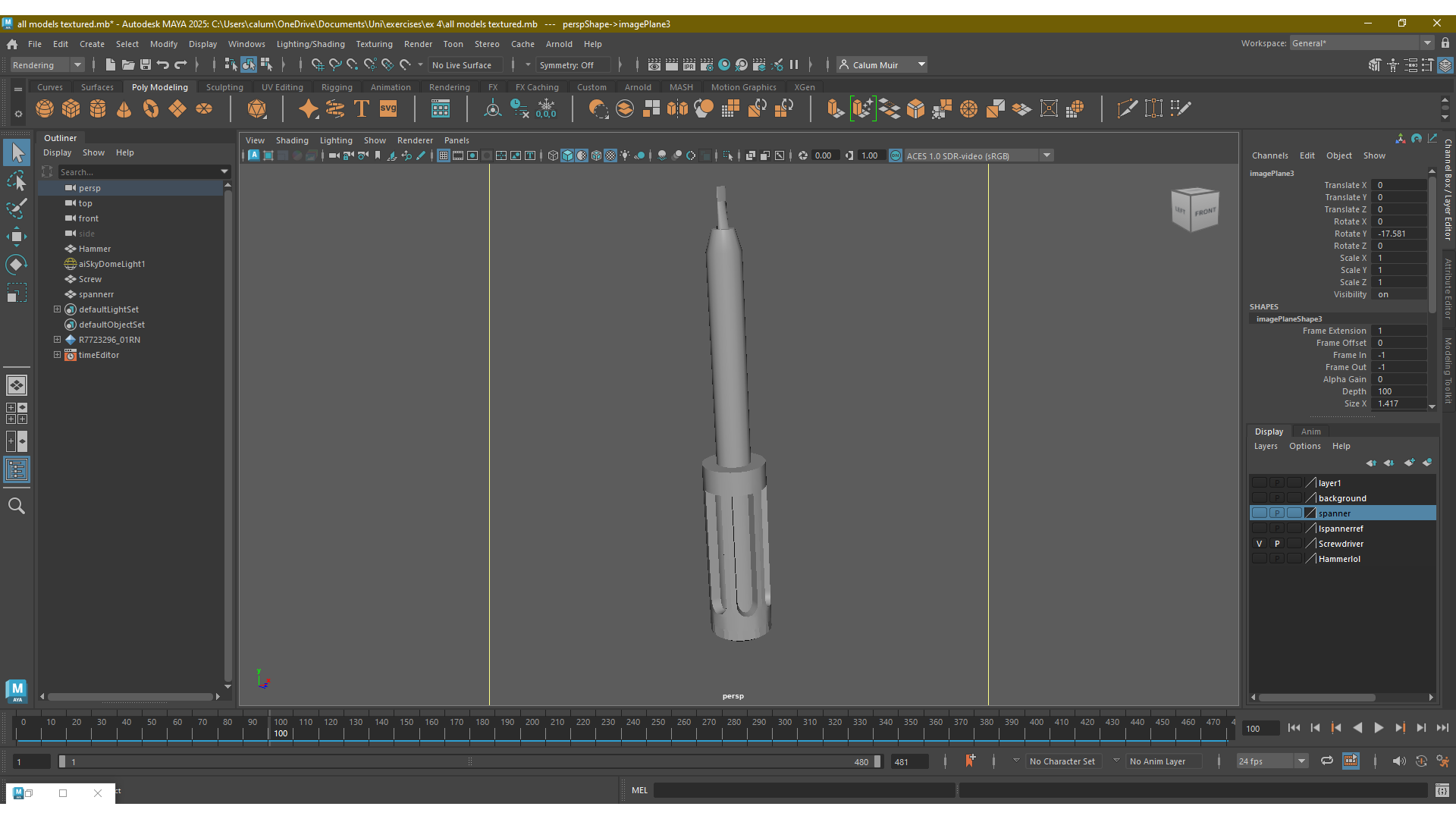 In this section, as stated the intended step was to improve on the product design, and in this step it was issued to design and model a series of products related to the topic. In this example as the brand had been decided as a tool company, the only appropriate option was to design some tools. Before it came to modelling anything, an overall design ethos had to be completed to ensure a similarity in style and aesthetics. To conform, a few rules were to be set in the spirit of designing. The first was that each design had to provide a comfort grip of some nature. The second being the ability to place embellishment detail through texture (such as the gold trim present). Finally, each design must be simple enough to incorporate the company branding on. The process was achieved through using reference imaging and error, utilising troubleshooting through available resources online and through tutorials. Simply put each model is a manipulated polygon utilising extrusions, scaling, bevelling and other forms of manipulation available through the maya software package. The final design choices became a hammer, a screwdriver, and a spanner as the author felt these would provide enough variability while still providing similar workflows that would enhance and provide suitable opportunities to practise the skills already learned in previous scenarios. It became important in figuring out the solution around providing a model that was suitable for easy UV unwrapping. This became the recurring hurdle that was a struggle to overcome at every opportunity, but provides an obvious point of improvement to work on independently for the author in their spare time.